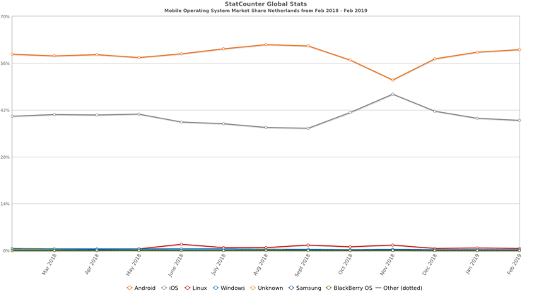 Zoals je hierboven kunt zien, valt het op dat het Android besturingssysteem het meest gebruikte mobiele systeem in Nederland is. Dit besturingssysteem telt ruim 57% van alle mobiele apparaten dat gebruikt wordt in ons land. Daarentegen zit Apple’s iOS op slechts 40%. Dat betekent dat Android en iOS ruim 97% van de mobiele apparaten in ons land vertegenwoordigen. Wanneer je graag jouw doelgroep wilt bereiken, is het belangrijk om met deze verdeling rekening te houden. Je wilt (immers) wel graag dat jouw app zoveel mogelijk gebruikt wordt.