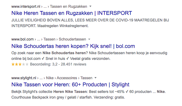 Zoekmachines zijn een belangrijke bron voor verkeer. Je kunt als het ware “gratis” bezoekers naar je website halen. Om met SEO te beginnen is het raadzaam om met een goede Title Tag en META description te werken. In het voorbeeld hiernaast zie je dat de Title Tag precies goed is. Daarentegen zit er in de META-description wel wat verschil. Op welk resultaat zou jij eerder klikken wanneer je op zoek bent naar een Nike tas? Waarschijnlijk zou jij het eerste resultaat over slaan en alleen oog hebben voor de andere twee. Dat is al een begin, echter is SEO een heel groot grijs gebied voor sommige mensen. Er komt namelijk heel veel bij kijken. Hier vind je een aantal tips waar je direct aan kunt gaan werken.